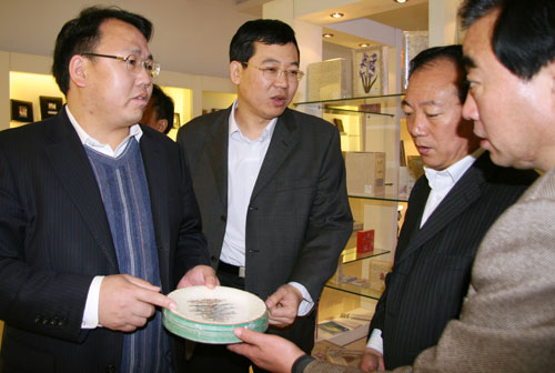 While visiting the company’s product exhibition hall, the exhibited digital frame on the wall let them stop. The staff introduced, from previous paper album, Guangbo imported high tech step by step, and finally self-developed this kind of digital frame. This was a qualitative leap realized by Guangbo people at the end of 2007. later, at the exchange meeting, Secretary Yang affirmed the company many years’ development set an example for many private enterprises, and wished Guangbo would create brilliance again in future.