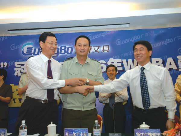 8月5日,解放軍八一體工大隊(duì)和浙江廣博集團(tuán)的“八一廣博文具女籃”冠名簽字儀式在北京舉行。當(dāng)八一體工大隊(duì)朱家志隊(duì)長與廣博文具的掌門人王利平董事長的手緊握在一起的時(shí)候,八一廣博文具女子籃球隊(duì)將與廣博集團(tuán)一道開始新一輪的征程。