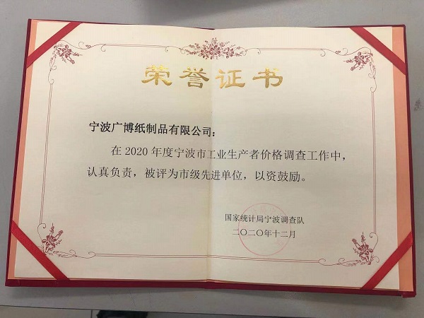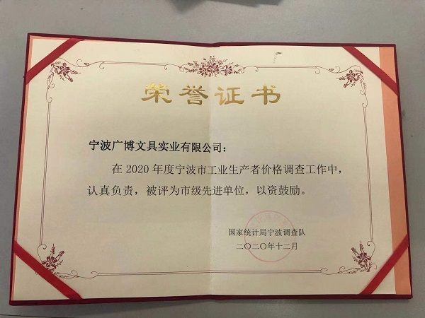 2020年,廣博集團(tuán)積極配合國(guó)家統(tǒng)計(jì)局寧波調(diào)查隊(duì)開展工業(yè)生產(chǎn)者價(jià)格統(tǒng)計(jì)調(diào)查工作,為提高全市工業(yè)生產(chǎn)者價(jià)格統(tǒng)計(jì)調(diào)查工作質(zhì)量貢獻(xiàn)了綿薄之力,因此廣博集團(tuán)股份有限公司、廣博文具實(shí)業(yè)有限公司、廣博紙制品有限公司榮獲了“市級(jí)先進(jìn)單位”稱號(hào)。
