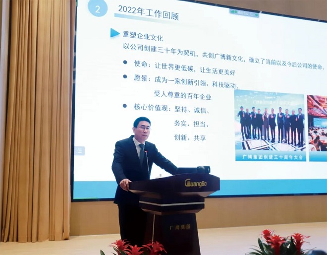 大會伊始,首先由集團公司黨委副書記、總經(jīng)理王君平作集團年度工作報告。報告中,王君平總經(jīng)理詳細回顧廣博集團2022年度經(jīng)營工作成就,分析存在問題,并提出2023年度經(jīng)營工作目標和各業(yè)務單位重點工作要求。王總說,2022年公司上下以董事會為核心,積極謀變應對,勇毅前行,在大家的共同努力下交出了一份來之不易的成績單。新的一年,公司要緊緊圍繞“以需求為導向,用行動把不可能變?yōu)榭赡?/span>”這一總綱,扎實落地宣貫企業(yè)文化價值觀,繼續(xù)加強人才體系建設,有效整合資源,打造全方位差異化競爭力,形成高質(zhì)量發(fā)展合力,實現(xiàn)質(zhì)的有效提升和量的合理增長。